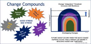 As many change strategists, including experts like Daryl Conner tell us, this threshold of “future shock” holds people and organizations back from being agile and adapting readily to new conditions. The solution is to build up our personal and organizational resilience so we can take on the levels of change now required for all of us, to keep us from boiling over and allowing us to integrate this new world.